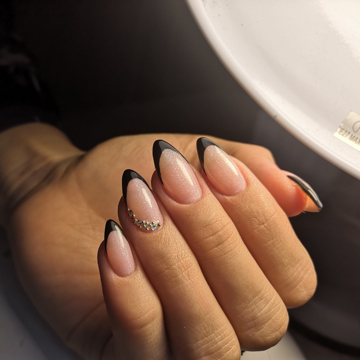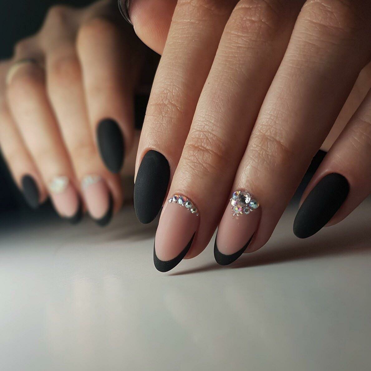 Френч черный на ногтях миндаль со стразами