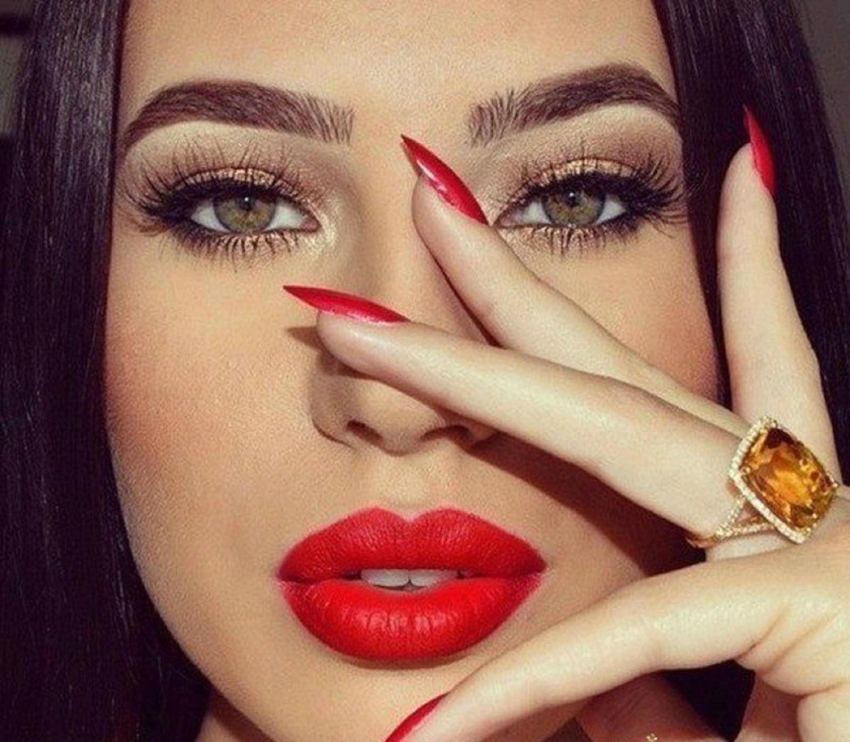 Брюнетка с красными губами и ногтями