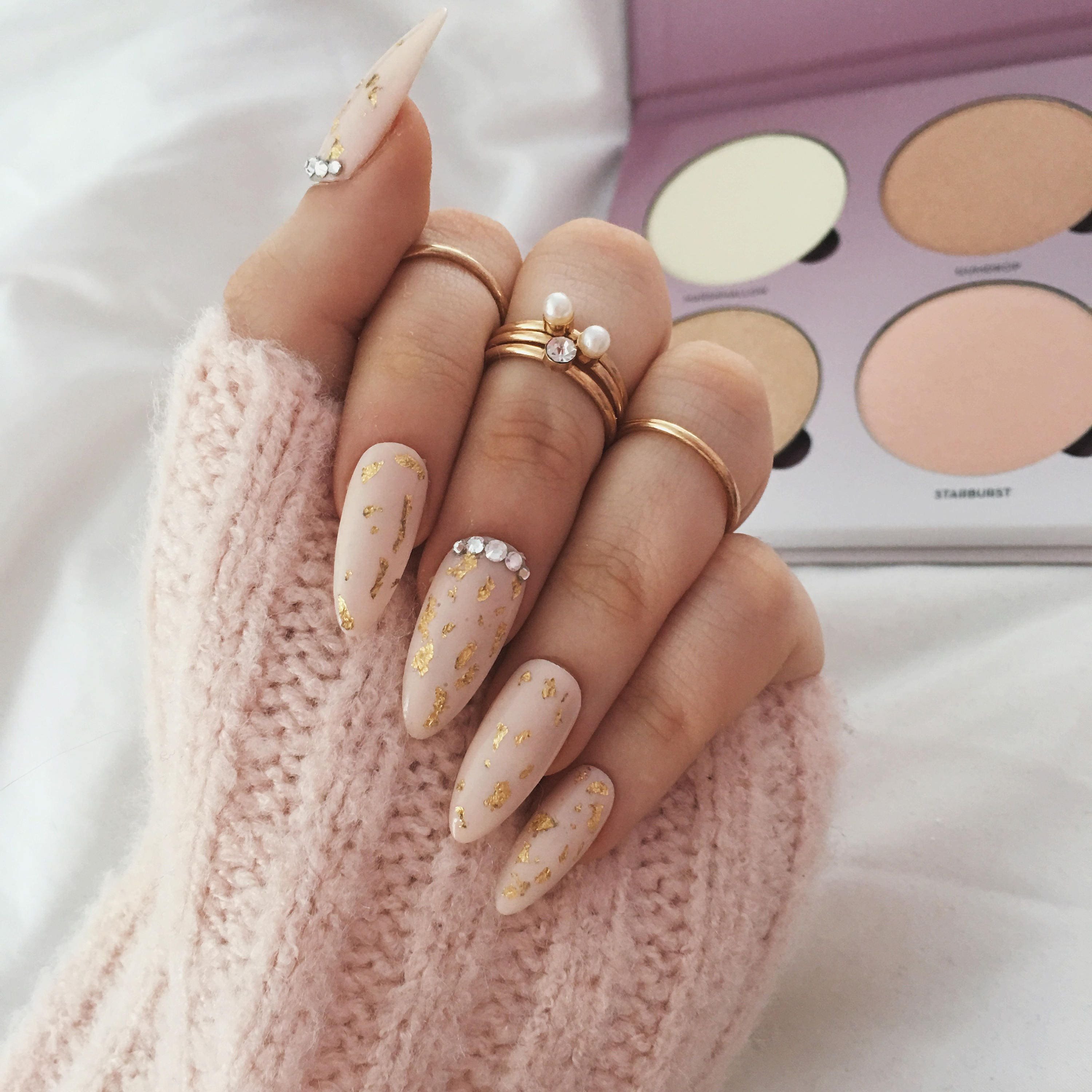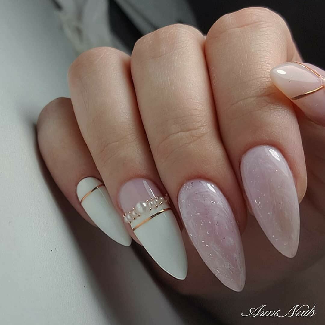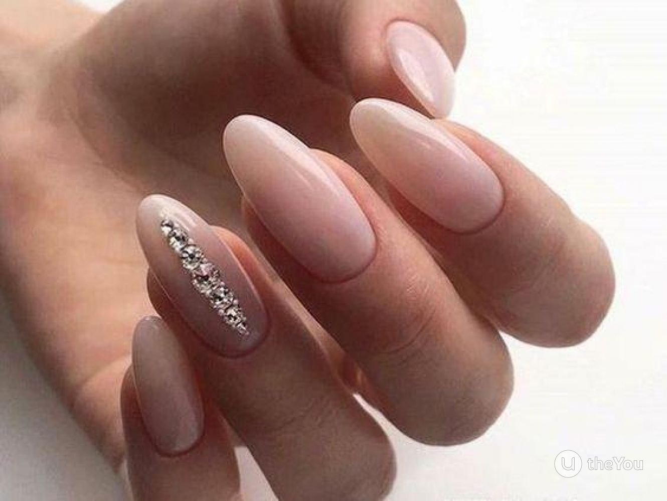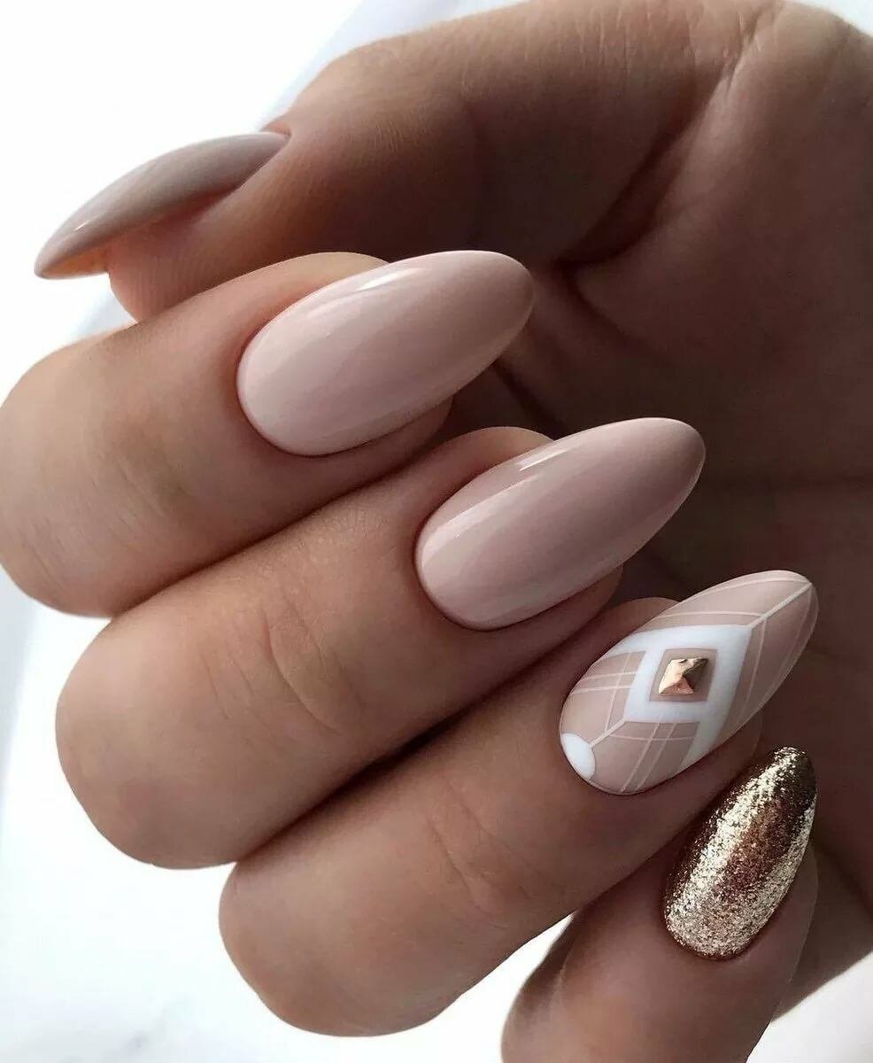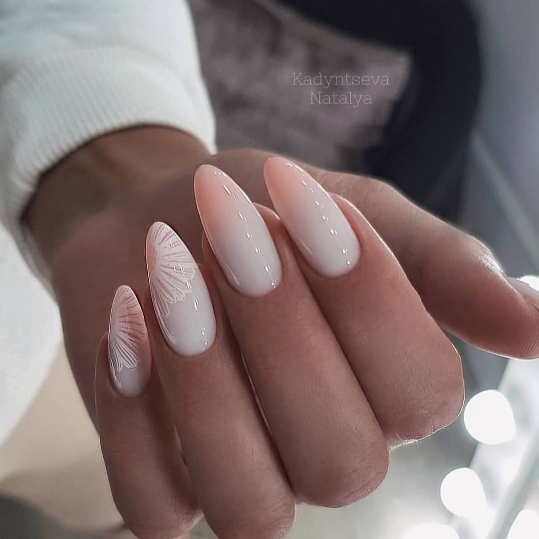 Нюдовый маникюр на миндалевидных ногтях с дизайном