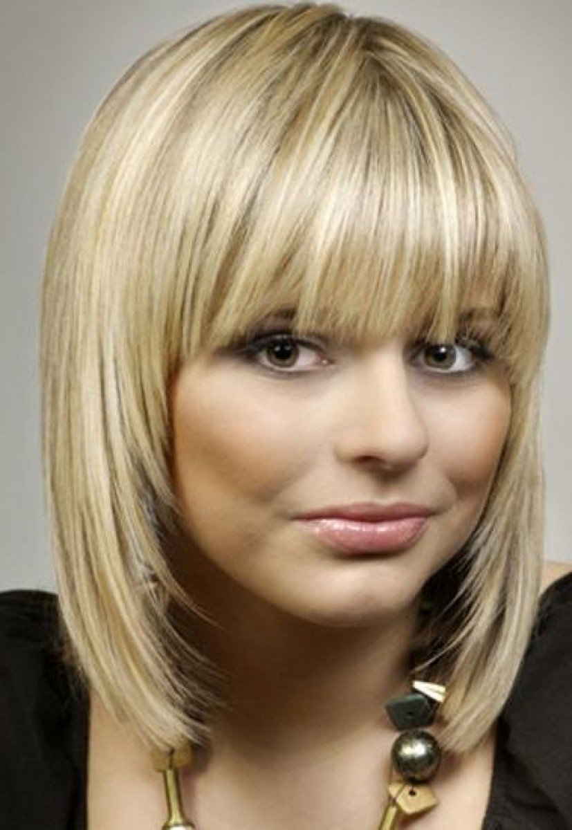 Стрижка Каскад на средние волосы с прямой челкой