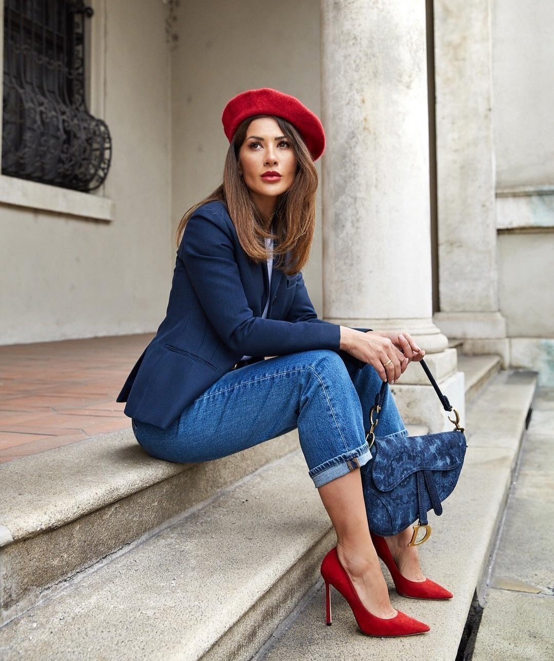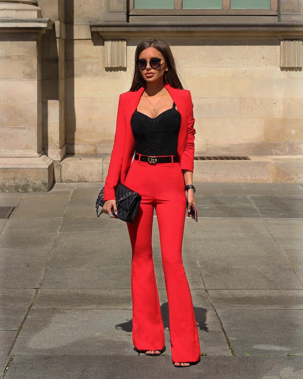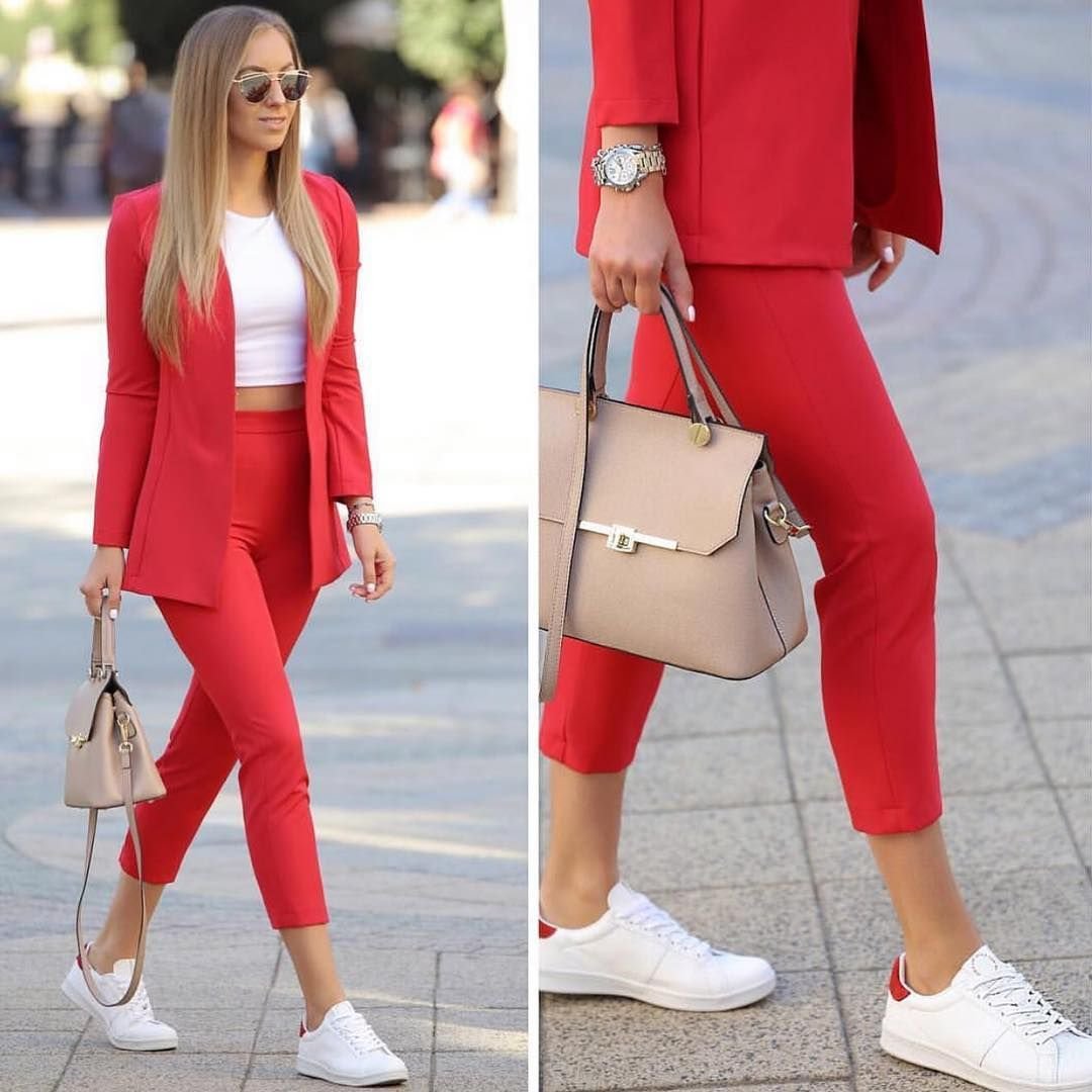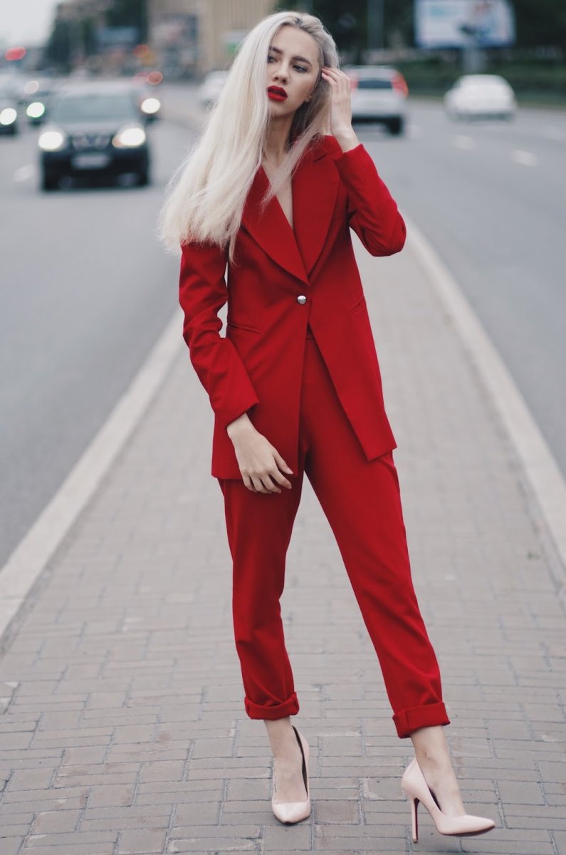 Лук с красным костюмом