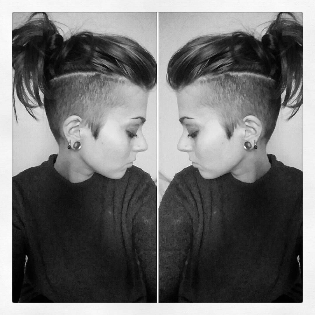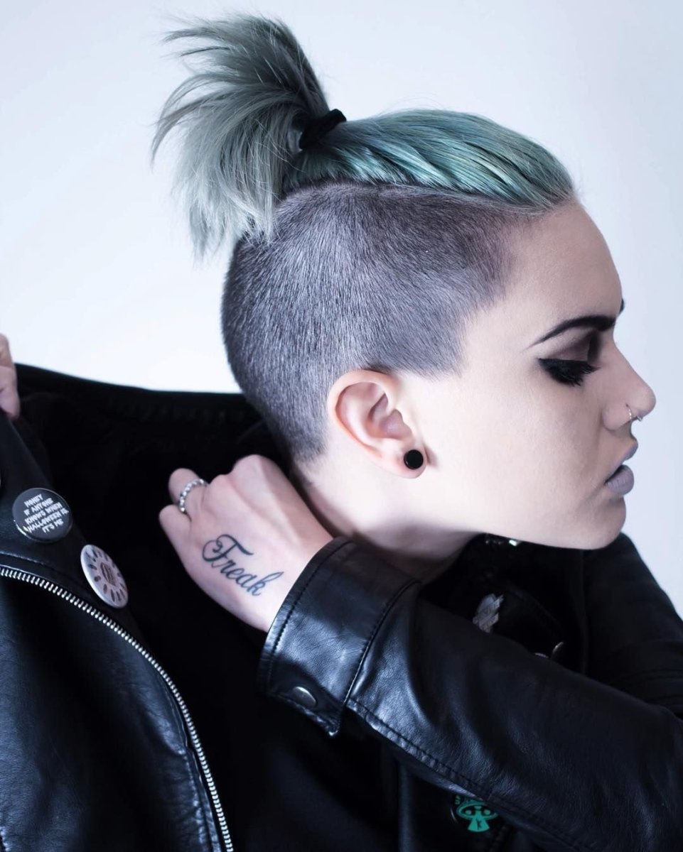 Женская прическа с выбритыми висками и затылком с хвостиком