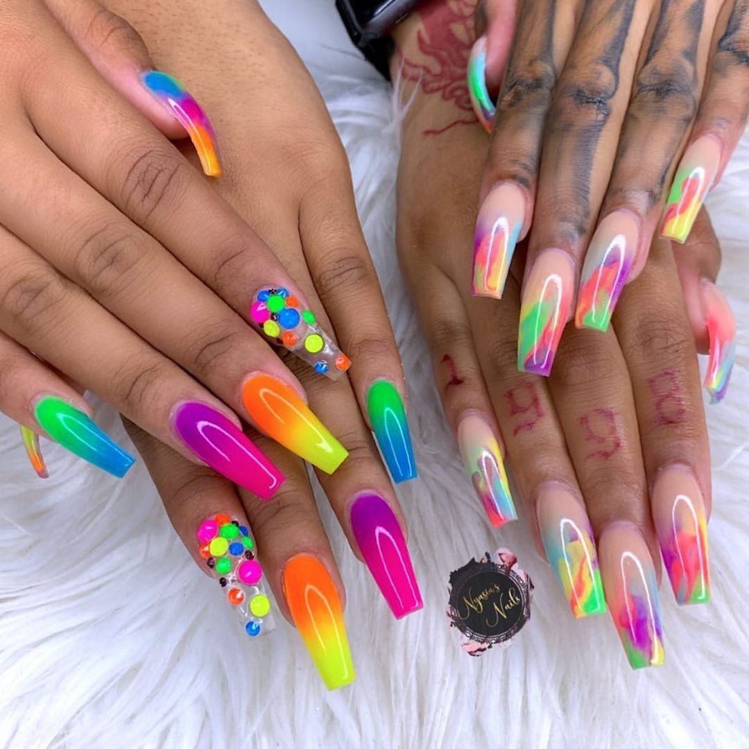 Яркий неоновый маникюр на длинные ногти