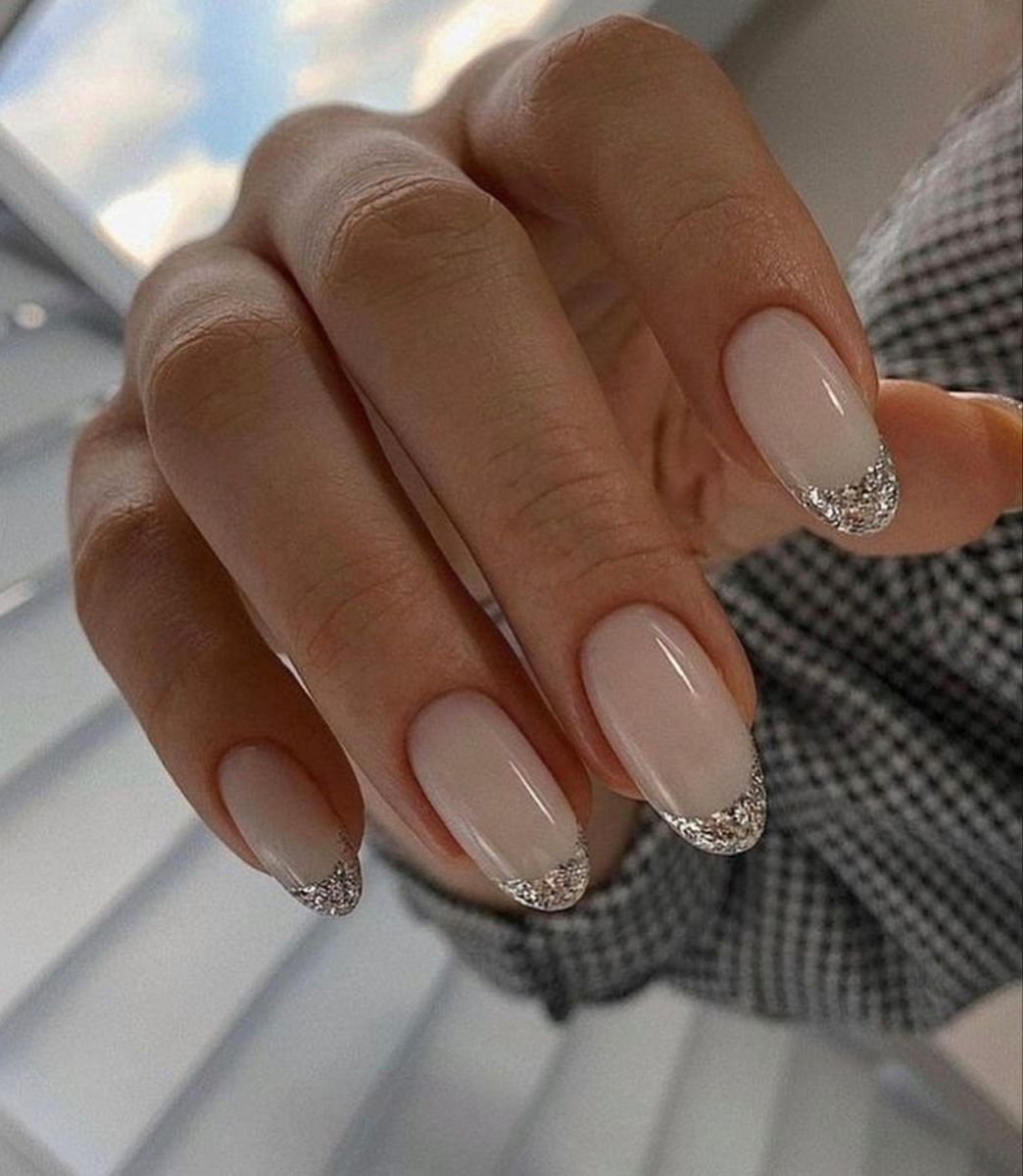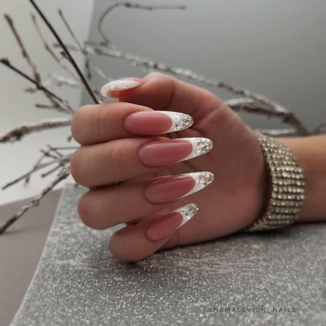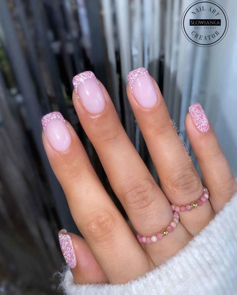Маникюр розовый френч с блестками