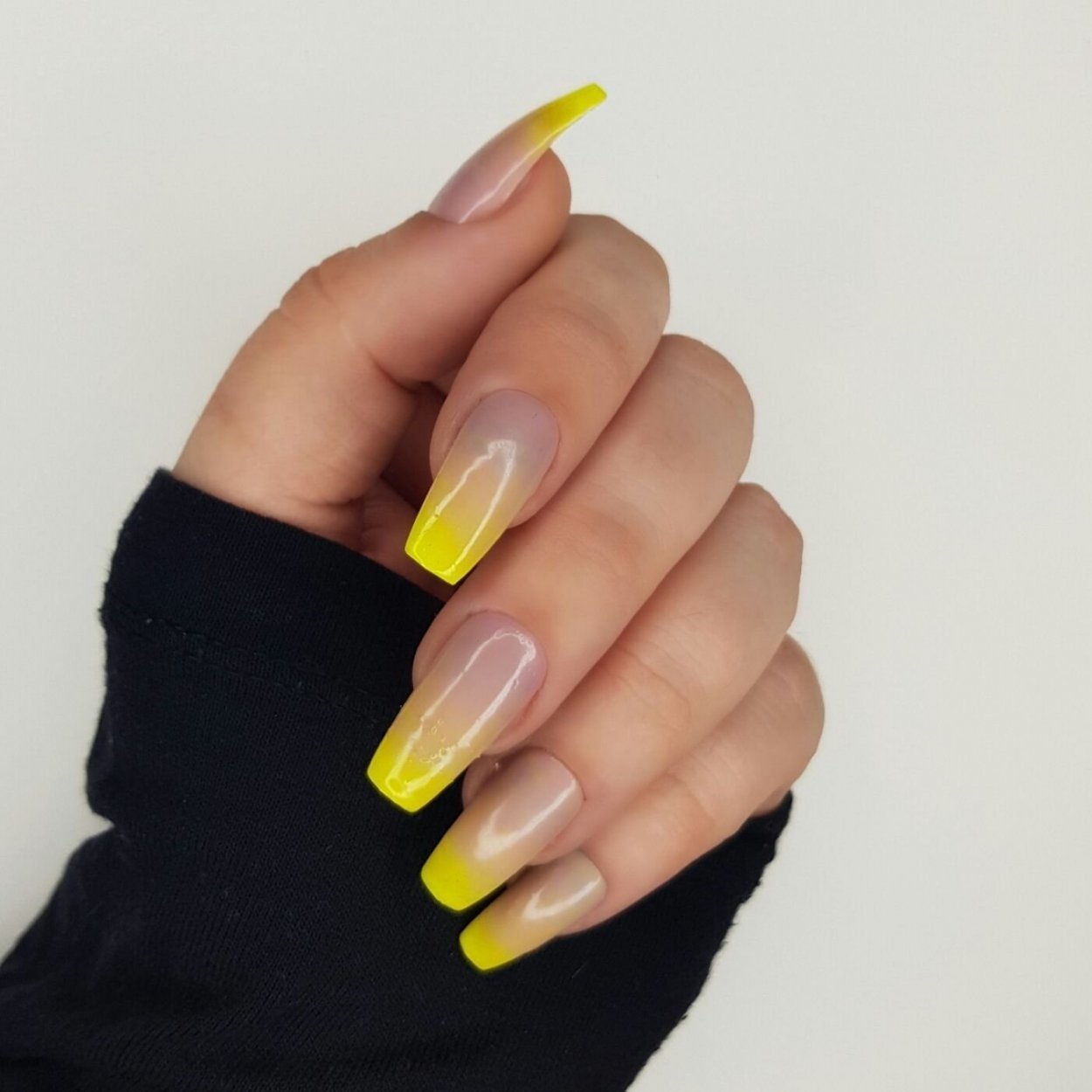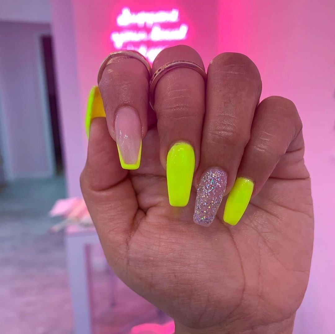 Неоновый желтый маникюр на квадратные ногти