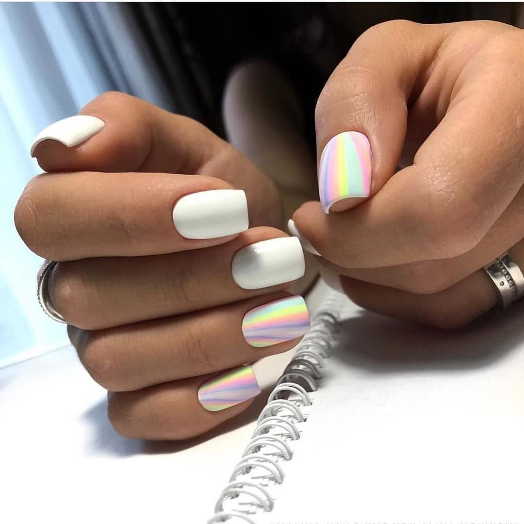 Белый маникюр с разноцветными полосками