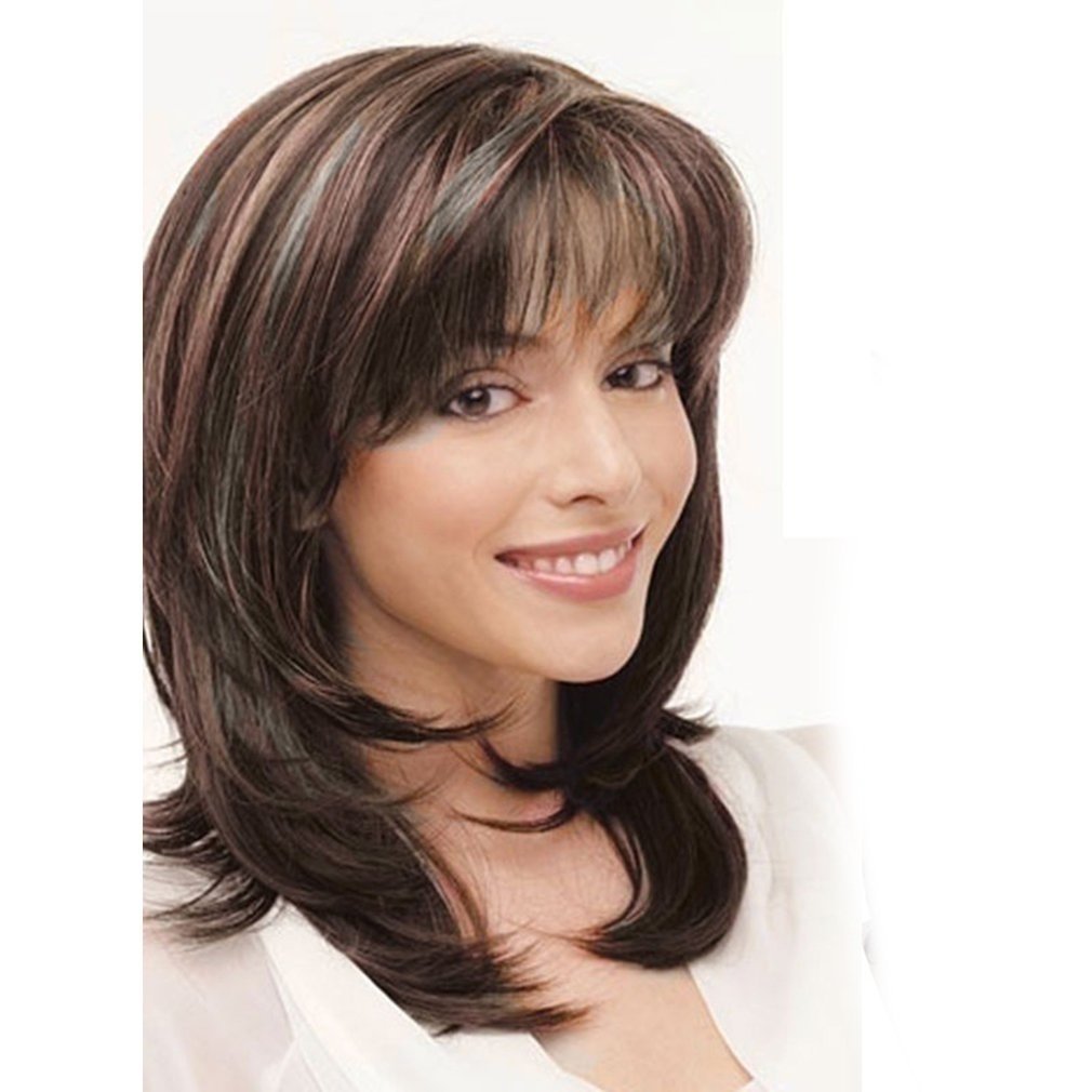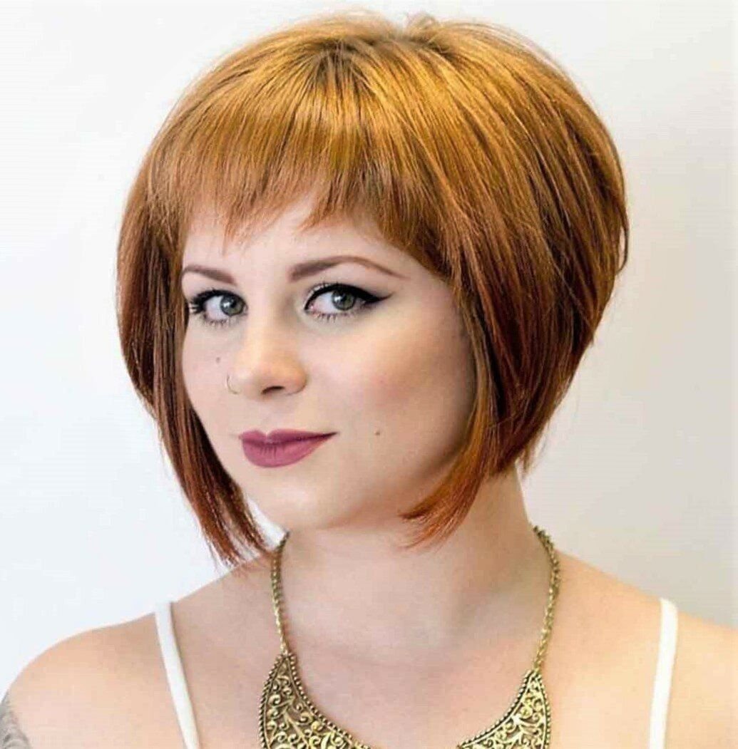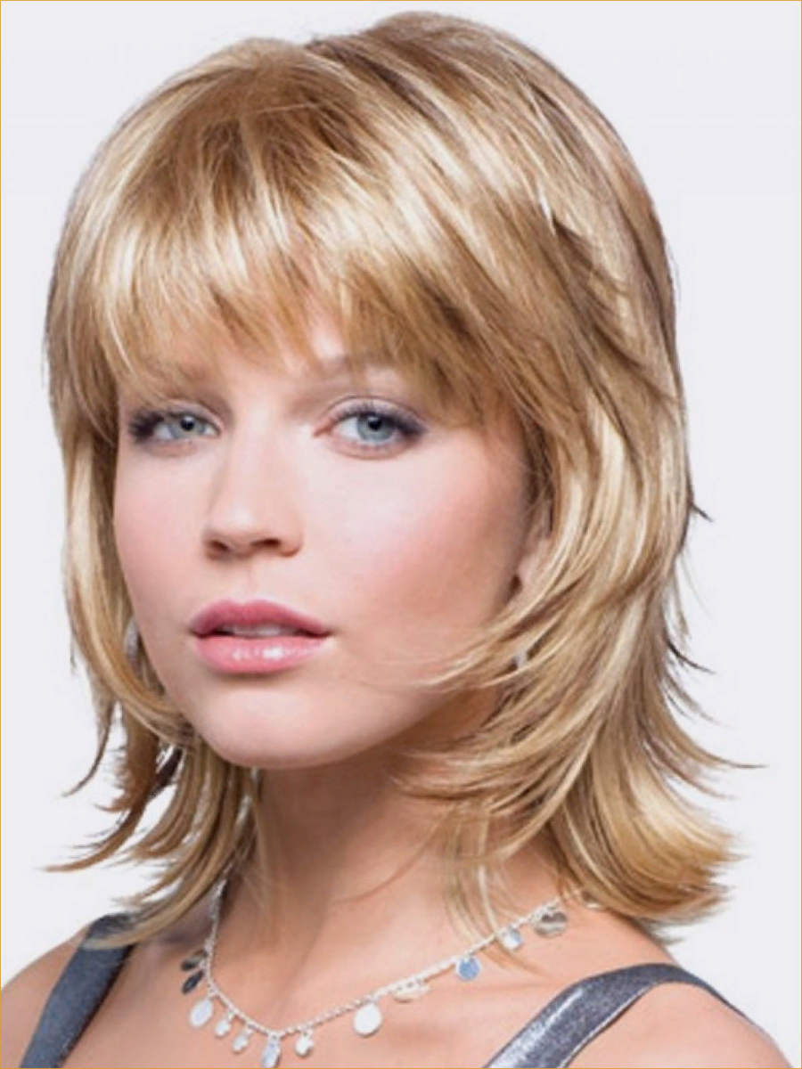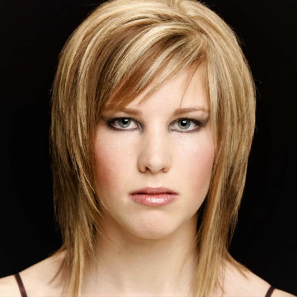 Стильные стрижки Каскад на средние волосы с челкой для круглого лица