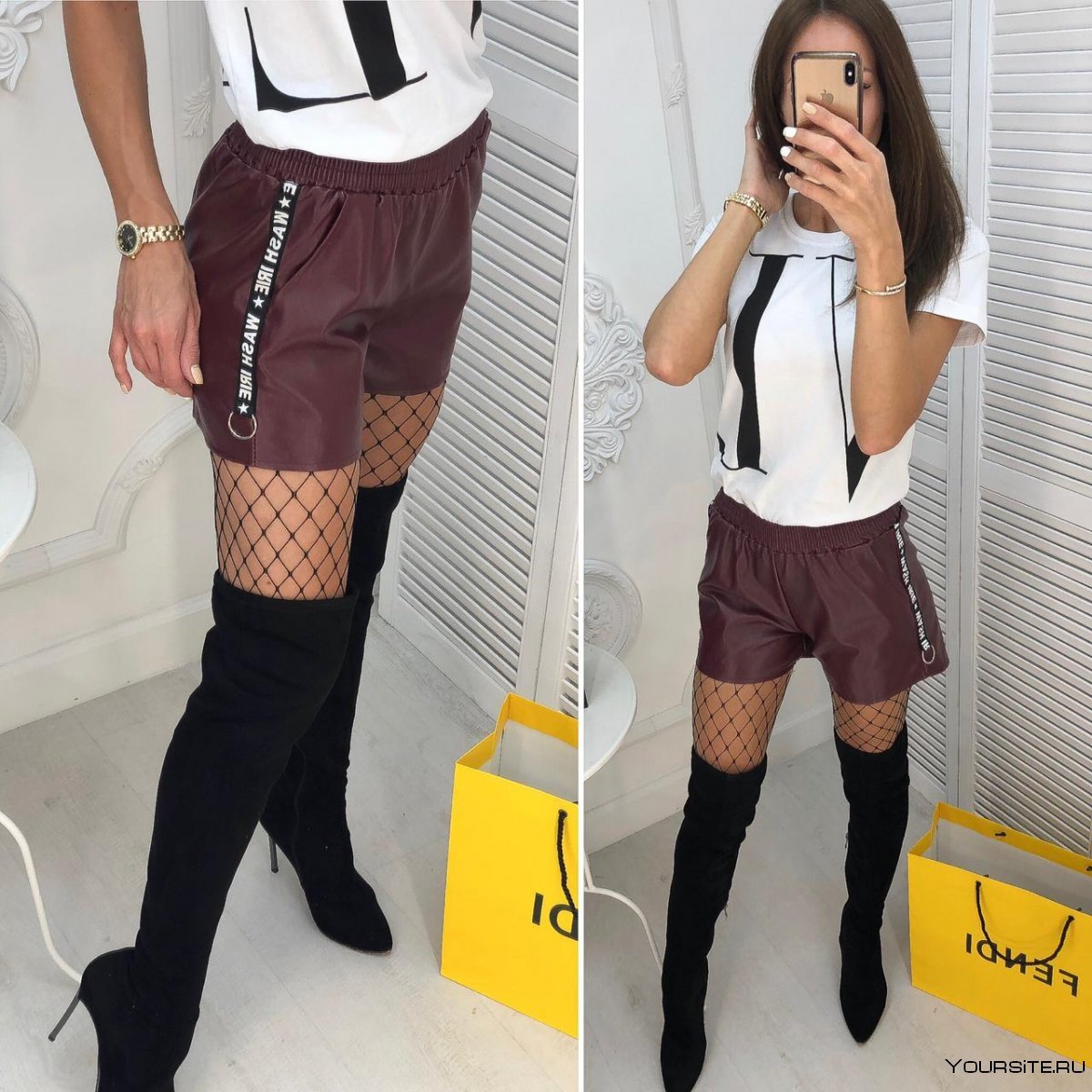 Кожаные шорты с сетчатыми колготками
