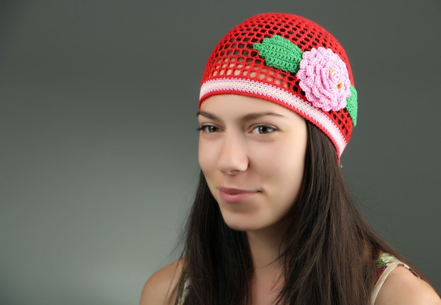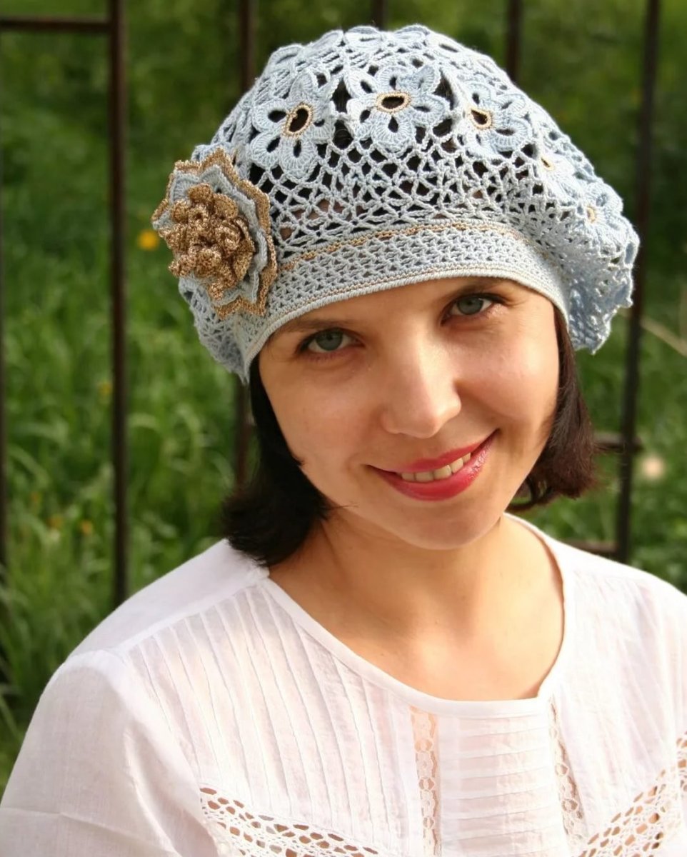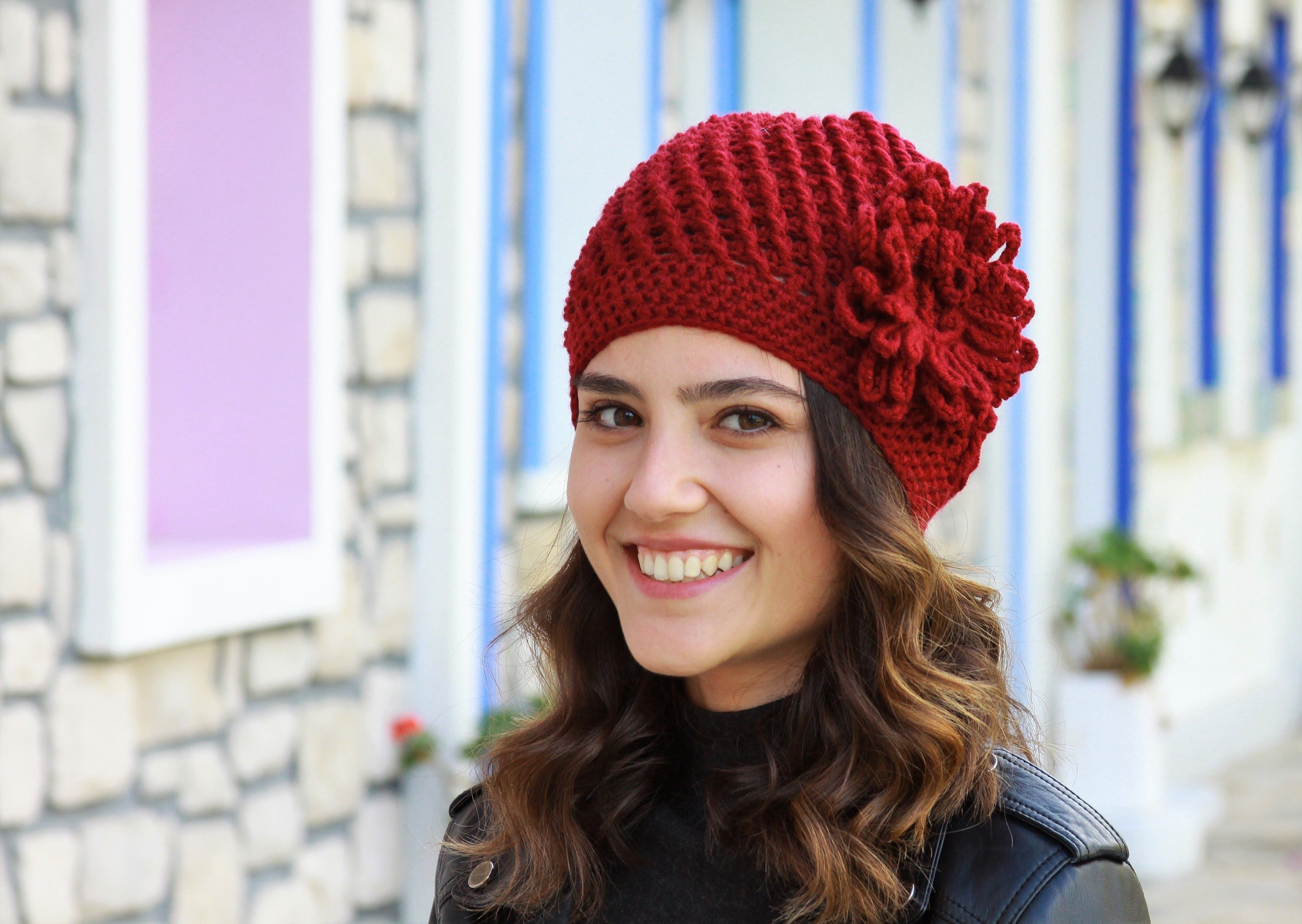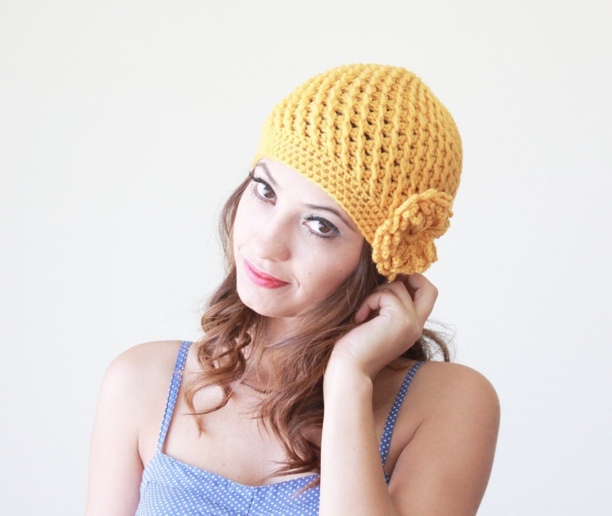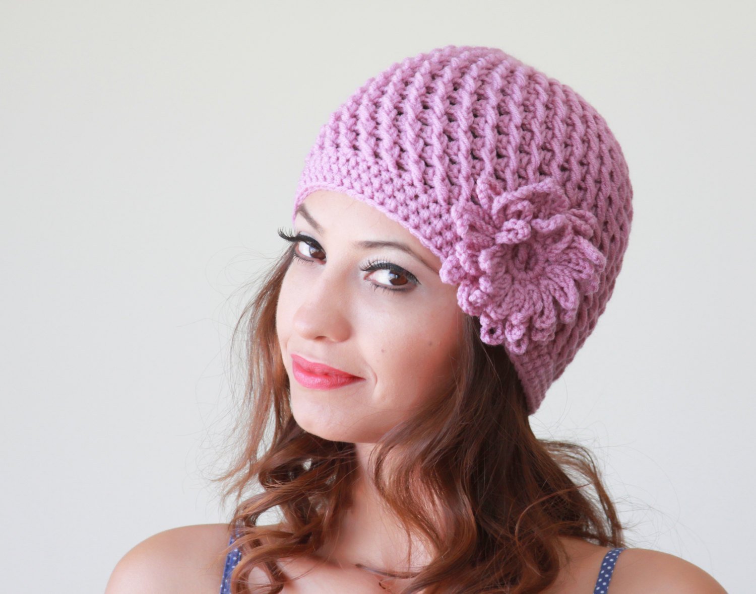 Женская шапочка крючком с украшением сбоку в ретро стиле