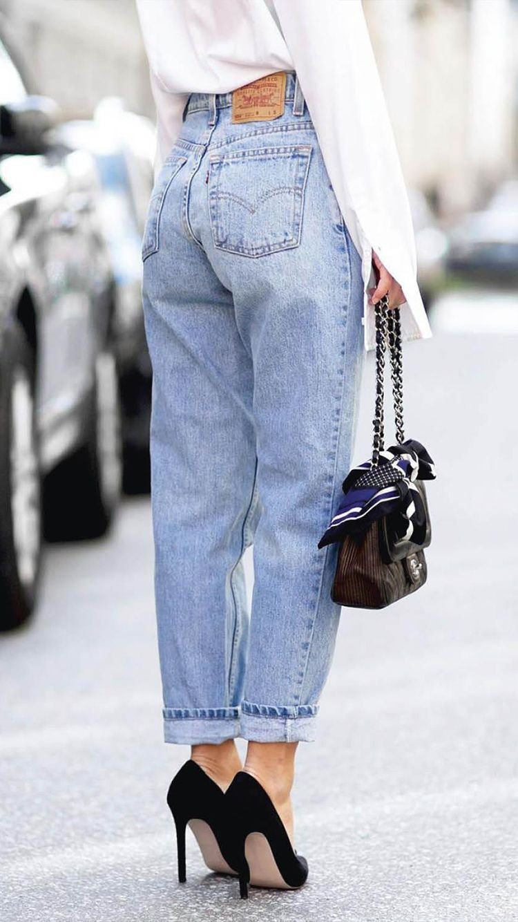 Джинсы мом с каблуками