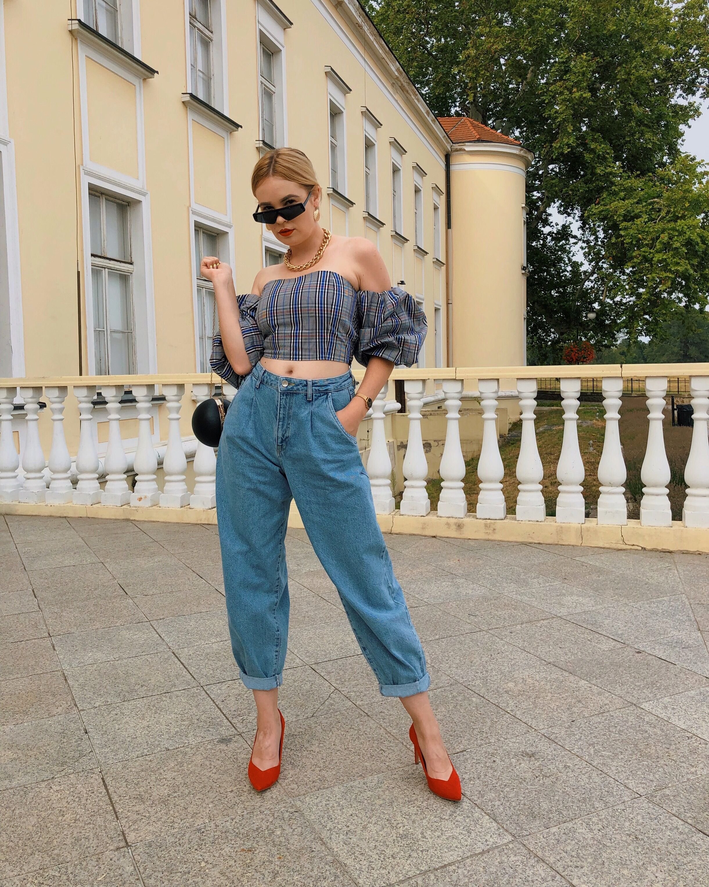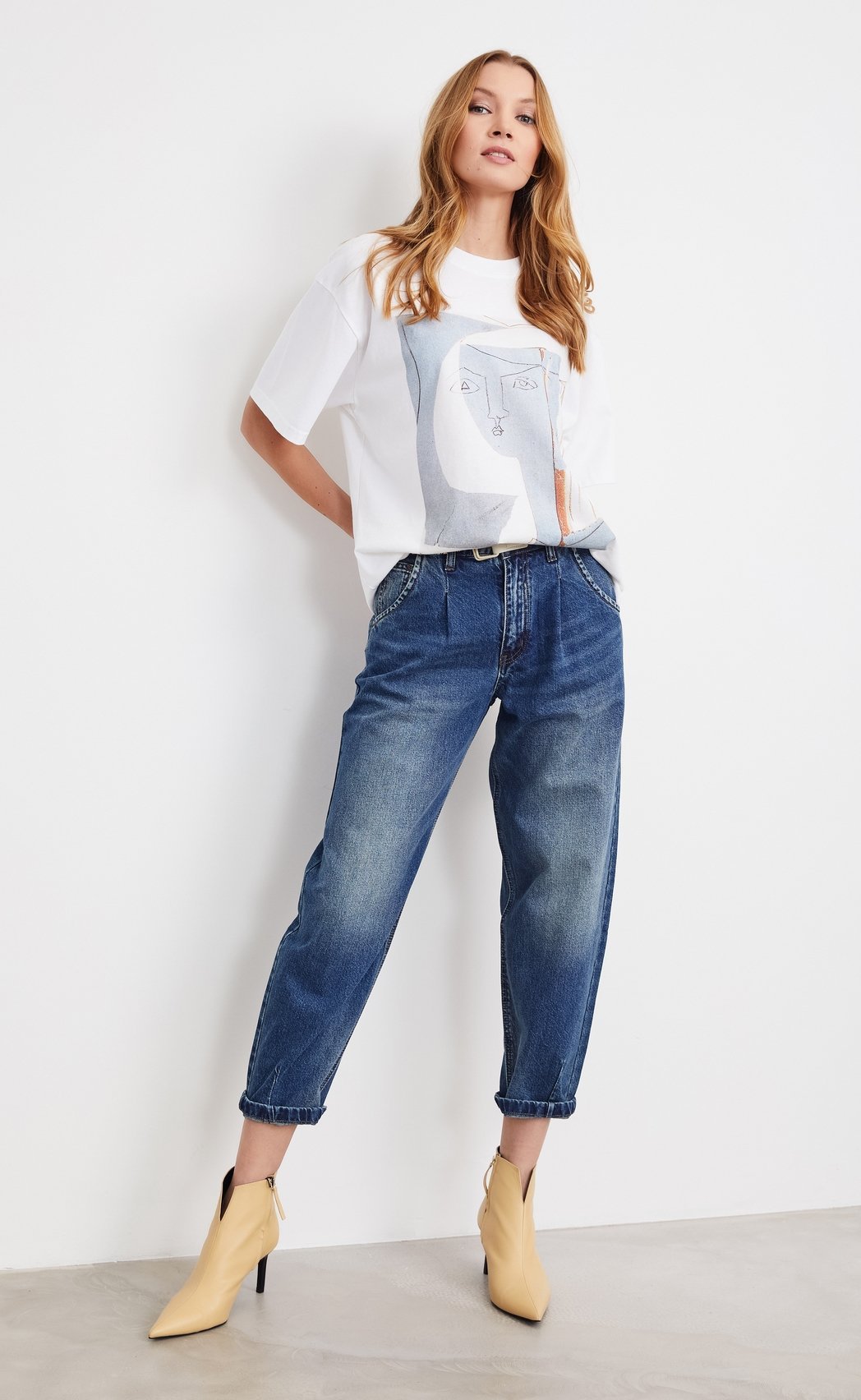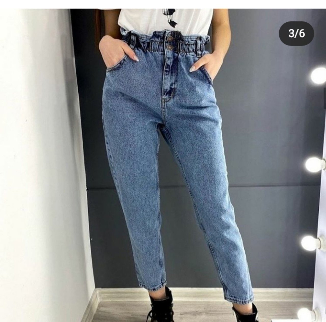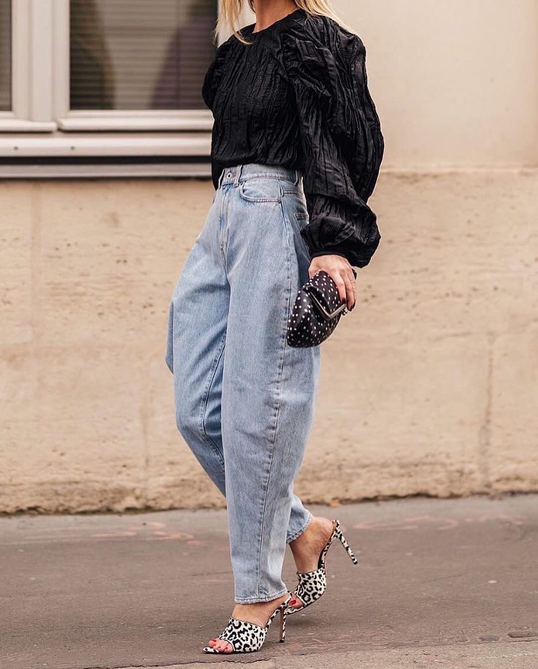 Джинсы багги с каблуками